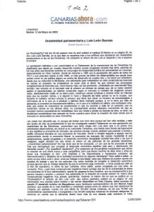 No me extiendo más sobre esta especie de preámbulo y reproduzco a continuación, por venir a cuento, mi artículo “Unanimidad parlamentaria y Luís León Barreto”, sobre la moratoria turística, publicado en el diario digital “CANARIASAHORA.COM” el 13 de mayo de 2003 (la Ley de Directrices se aprobó por el Parlamento el 14 de abril de 2003) en respuesta al artículo de Luís León Barreto publicado en el diario “LA PROVINCIA/DLP” en su columna “El Balcón” el 30 de abril de 2003. Si bien mi artículo es algo largo, puede que quienes tengan inquietud por la política turística que ha seguido Gran Canaria en la década de los noventa y desde el 2001 hasta el día de hoy, teniendo en cuenta que el binomio turismo/construcción representa el 80%, aproximadamente, de nuestra economía, lo lea hasta el final. (Para agrandar el texto del artículo entrar en mi página web http//danielgarzonluna.blogspot.com y hacer click sobre èl).