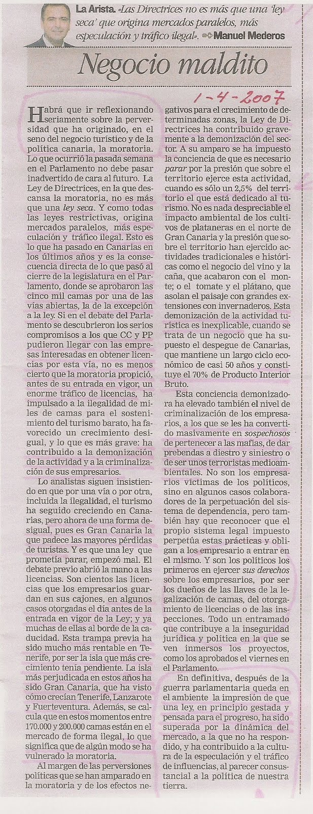 El pasado día 7 publiqué en mi otro blog, «GRAN CANARIA EN SU ENCRUCIJADA» (http://danielgarzonluna.blogspot.com ), una reproducción de un artículo que Juan I. Jiménez Mesa (q.e.p.d.) publicó en su columna «CONTRACORRIENTE» en La Provincia/DLP el 4 de junio de 2005. Hoy vuelvo a reproducir aquí un artículo de ‘extramuros’, en este caso de Manuel Mederos, publicado el 1 de abril de 2007 en su columna habitual «LA ARISTA» en Canarias7.