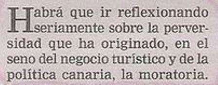 El lector puede que se pregunte si estoy desenpolvando el ‘baúl de los recuerdos’ y sacándolos aquí ‘en procesión’ pero no es así exactamente. De lo que se trata es de poner sobre la mesa opiniones vertidas hace bastantes años con una claridad meridiana sobre las moratorias turísticas que tantísimo daño han ocasionado a Gran Canaria en todos los aspectos. Manuel Mederos ha profundizado tanto sobre las moratorias y ha tratado el asunto con tanta crudeza en este artículo, denominando incluso la Ley de Directrices como ‘Ley Seca’, que su lectura facilitará sin ninguna duda el que cualquier ciudadano de a pie comprenda y entienda el trajín que políticos irresponsables se han traído, y se siguen trayendo, entre manos con este enredo de las moratorias turísticas que tienen congelado el crecimiento económico de Gran Canaria desde hace dos décadas.