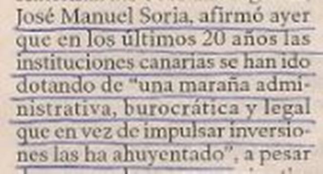 La información elaborada por Haridian Mederos son declaraciones de José Manuel Soria a cuento de la parálisis que sufre el crecimiento económico de Gran Canaria de lo que culpa a la maraña administrativa, de burocracia y legal que sufre Canarias y que ha cercenado de raiz toda posibilidad de desarrollar cualquier proyecto económico en Gran Canaria, especialmente.