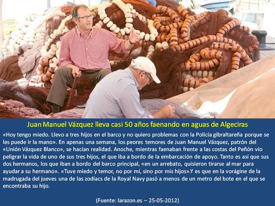 «Anoche, mientras faenaban frente a las costas del Peñón vio peligrar la vida de uno de sus tres hijos, el que iba a bordo de la embarcación de apoyo. Tanto es así que sus dos hermanos, los que iban a bordo del barco principal, «en un arrebato, quisieron tirarse al mar para ayudar a su hermano». «Tuve miedo y temor, no por mí, sino por mis hijos».Y es que en la vorágine de la madrugada del jueves una de las zodiacs de la Royal Navy pasó a menos de un metro del bote en el que se encontraba su hijo.»