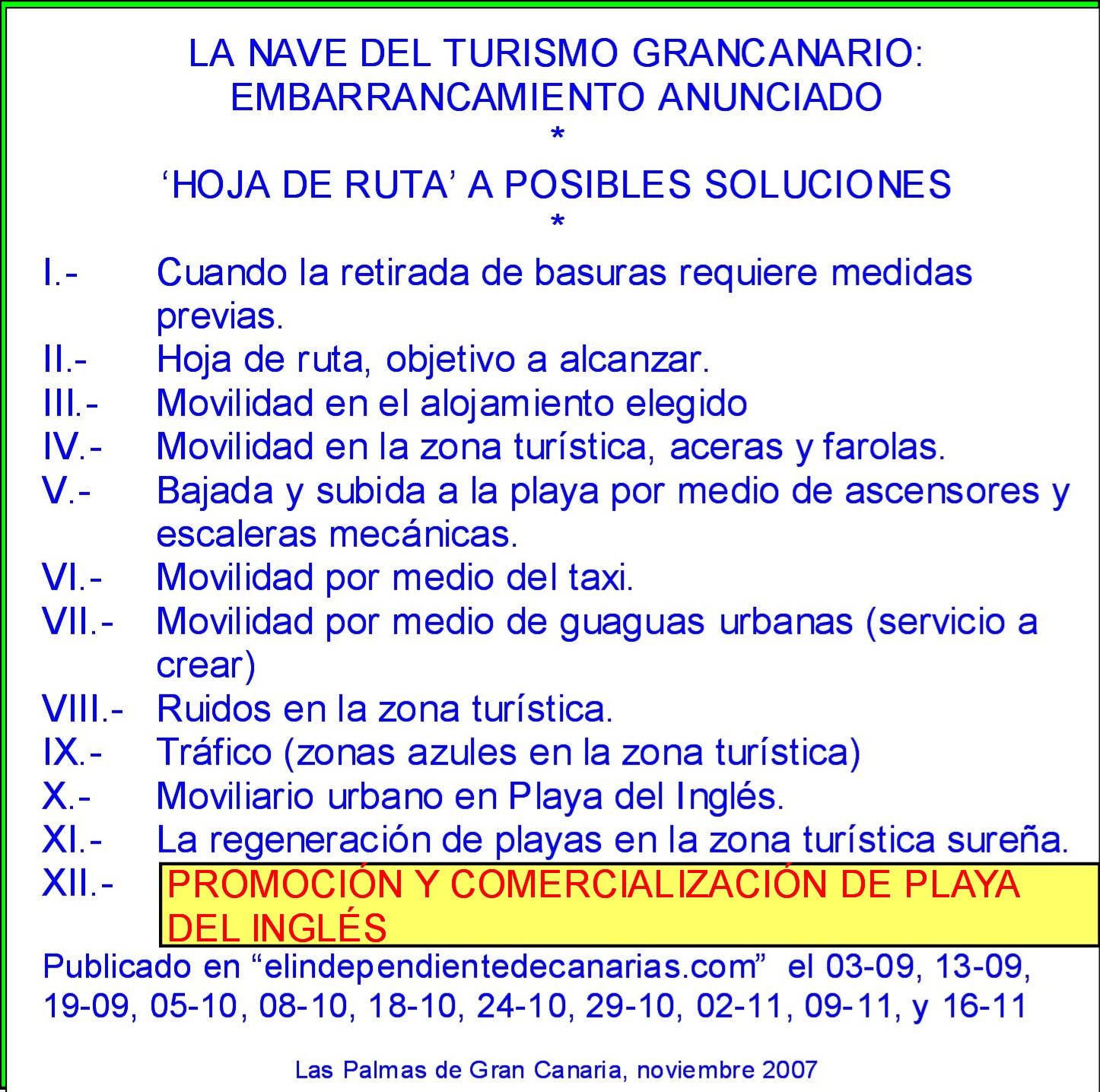 En este ‘capítulo’, XII y último de mi ‘serial’ “LA NAVE TURÍSTICA GRANCANARIA: EMBARRANCAMIENTO ANUNCIADO”, trataré de forma muy sintetizada la promoción y comercialización turística de Playa del Inglés, tal como la veo para los fines expuestos en el ‘capítulo’ II, “’HOJA DE RUTA’, CON OBJETIVO A ALCANZAR”, publicado en el “elindependientedecanarias.como” el 13-09-2007 y colgado en mis páginas Web de la misma fecha. En este planteamiento apostaba por el turismo de salud como salida a la situación de agotamiento en que se encuentra el modelo actual, considerando los activos con que cuenta Playa del Inglés para poder emprender una nueva ruta con posibilidades de éxito, activos entre los que destaca el factor CLIMA, inalterable a influencias interesadas o gestores inoperativos y sobre el que tiene que descansar cualquier iniciativa comercial que busque la reactivación del mercado hacia lo positivo de la oferta de la cama extrahotelera en Playa del Inglés, porque, con la excepción del factor CLIMA y la playa, no hay ninguna otra razón material, aparte de las que pudiera haber de tipo humano, que haga a un posible turista decidirse por unas vacaciones en un establecimiento extrahotelero de Playa del Inglés en lugar de en cualquier otro destino turístico competidor de Gran Canaria. Por tanto, dedico sólo unas cuantas líneas a las alrededor de 20.000 CAMAS HOTELERAS existentes en Playa del Inglés, que no entran precisamente en la línea de la manida obsolescencia en casi su totalidad, las cuales, aunque sí sufren también las consecuencias del abandono casi generalizado que impera en toda la urbanización por parte de las administraciones competentes, no están en una situación de agobio para poder comercializarse por estar la demanda de la cama hotelera en permanente alza y su gestión está, en casi todos los casos, en manos de consejos de administración con posibilidad de toma de decisiones fáciles y rápidas.