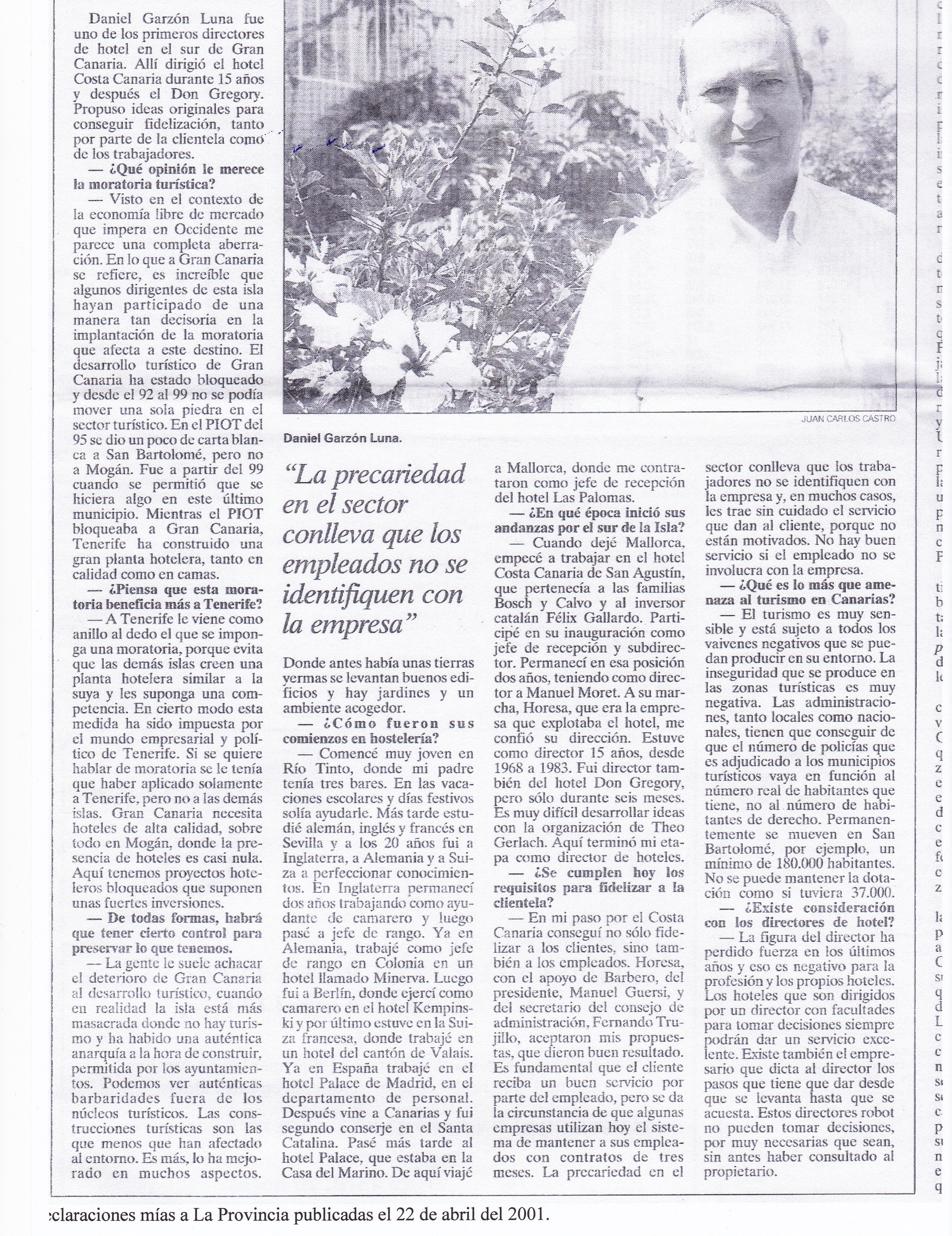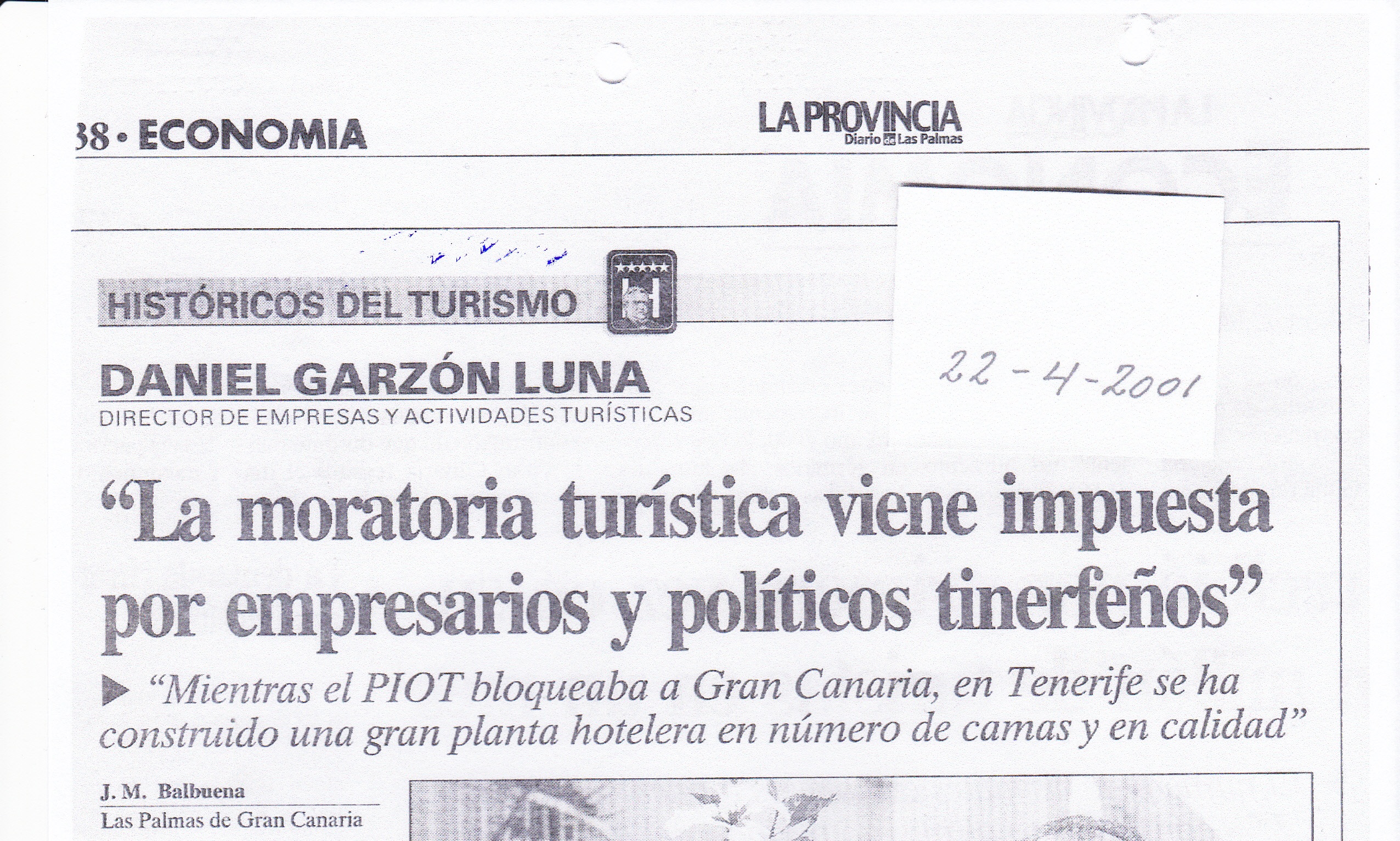 Mis pronunciamientos contra el intervencionismo en el crecimiento turístico data desde fechas anteriores a la aprobación de la primera ley de moratoria, la fatídica ley de Las Directrices que fue aprobada por el parlamento canario el 14 de abril de 2003 y los dos Decretos de moratoria que ya fueron puestos en vigor en el 2001, aunque terminaron siendo anulados por el Tribunal Supremo. (Ver mis declaraciones a «La Provincia/DLP» a cuento de la moratoria del 2001 publicadas el 22 de abril del 2001)