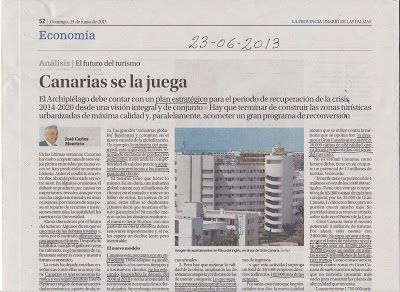 Se puede decir que hoy, 23 de junio de 2013, Gran Canaria tiene una importante razón para estar de enhorabuena. Me permito aseverar, con rotundidad, que hay sobrados motivos para ello y me refiero al contenido del artículo de opinión que José Carlos Mauricio publica hoy en el diario de papel «La Provincia/DLP» en su página de «Economía».