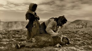 1915/1925 Mujer armenia con dos hijos en el desierto de Mesopotamia, uno en el suelo, parece muerto. Al fondo la ciudad de de Alepo (hoy siria).