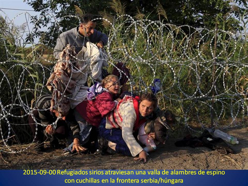 2015-09-00 Una familia de refugiados sirios con niños pequeños intentan cruzar una valla de alambres de espino con cuchillas. ¿Tendrían la inmensa suerte de que no quedara algún pequeño atrapado en los alambres?