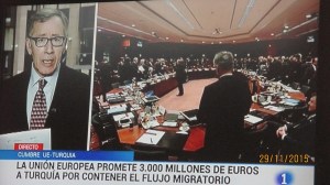 2015-11-29 La Cumbre de la UE con Torquía. Los 28 socios de la Unión se comprometen a entregar a Turquía 3.000 millones para que frene el flujo de migrantes hacia la UE y elimine a las mafias que trafican con los refugiados.